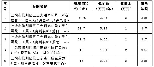 信州區五三大道202號三處及信江東路兩處商鋪招租(三年)拍賣(mài)公告